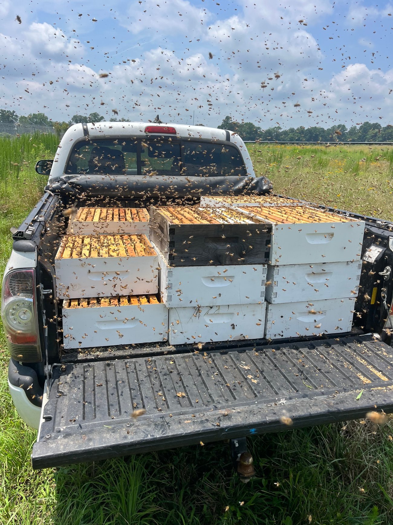 Right after loading up the panels, the bees get a little stir-crazy! With a couple hundreds of pounds of honey in the back, all that’s left is to wait for the swarming bees to settle down before the truck heads off with the haul.